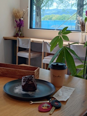 結果的に東に走り敦賀からマキノメタセコイヤ並木より少し早いカフェタイムでカフェオーレとチョコレートスコーン頂きました。