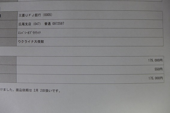 1月は江戸より譲り受けがあり1台20,000円義援金のお約束で本日合わせて175,000円写真のエンバシーウクライナ(ウクライナ大使館)義援金としてお送りいたしまた。