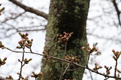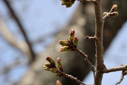 今朝はガレージクレヨンの横の公園の桜の枝を見ていると.この気温が今週続くなら